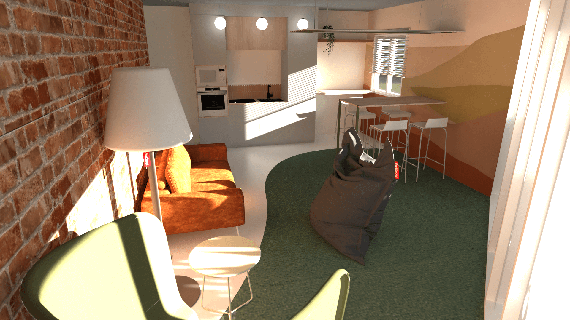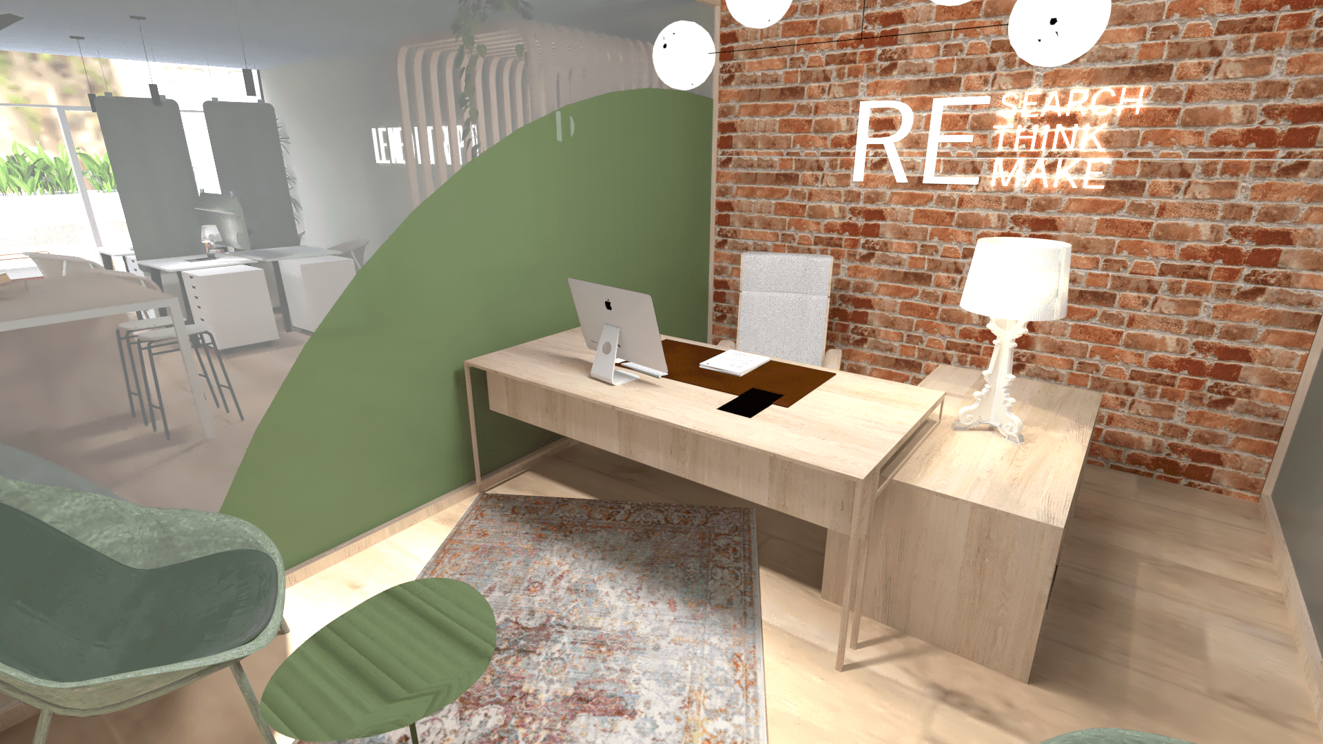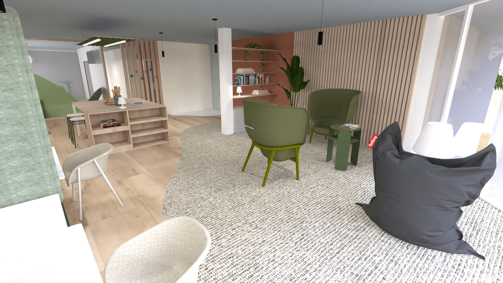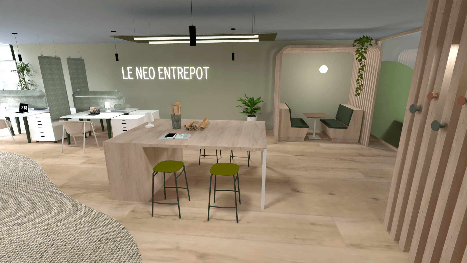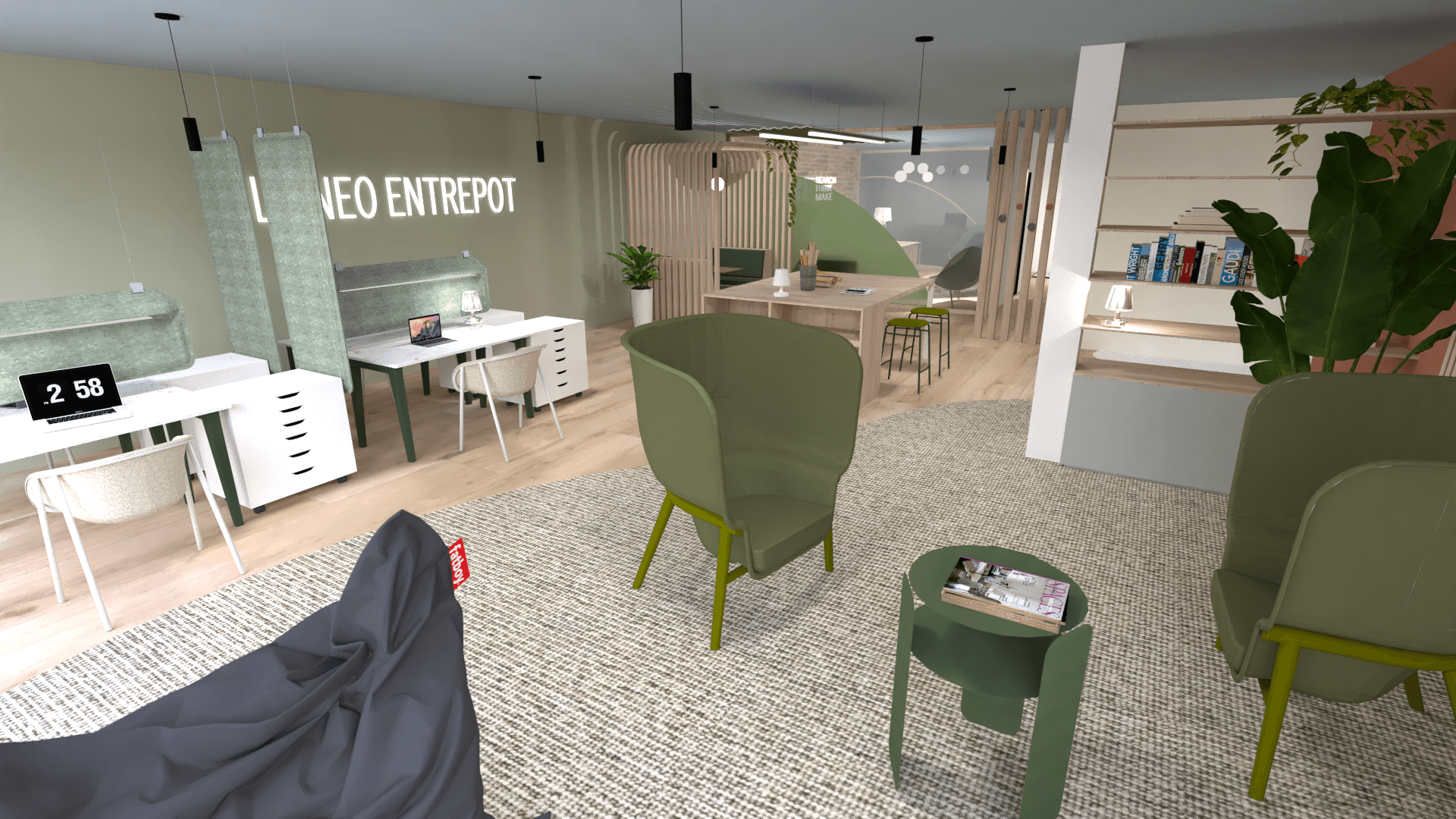 Pour ce projet que j’ai décidé de nommer le « néo-entrepôt« , j’ai souhaité une ambiance propice à la créativité, à la verdure, à la détente.