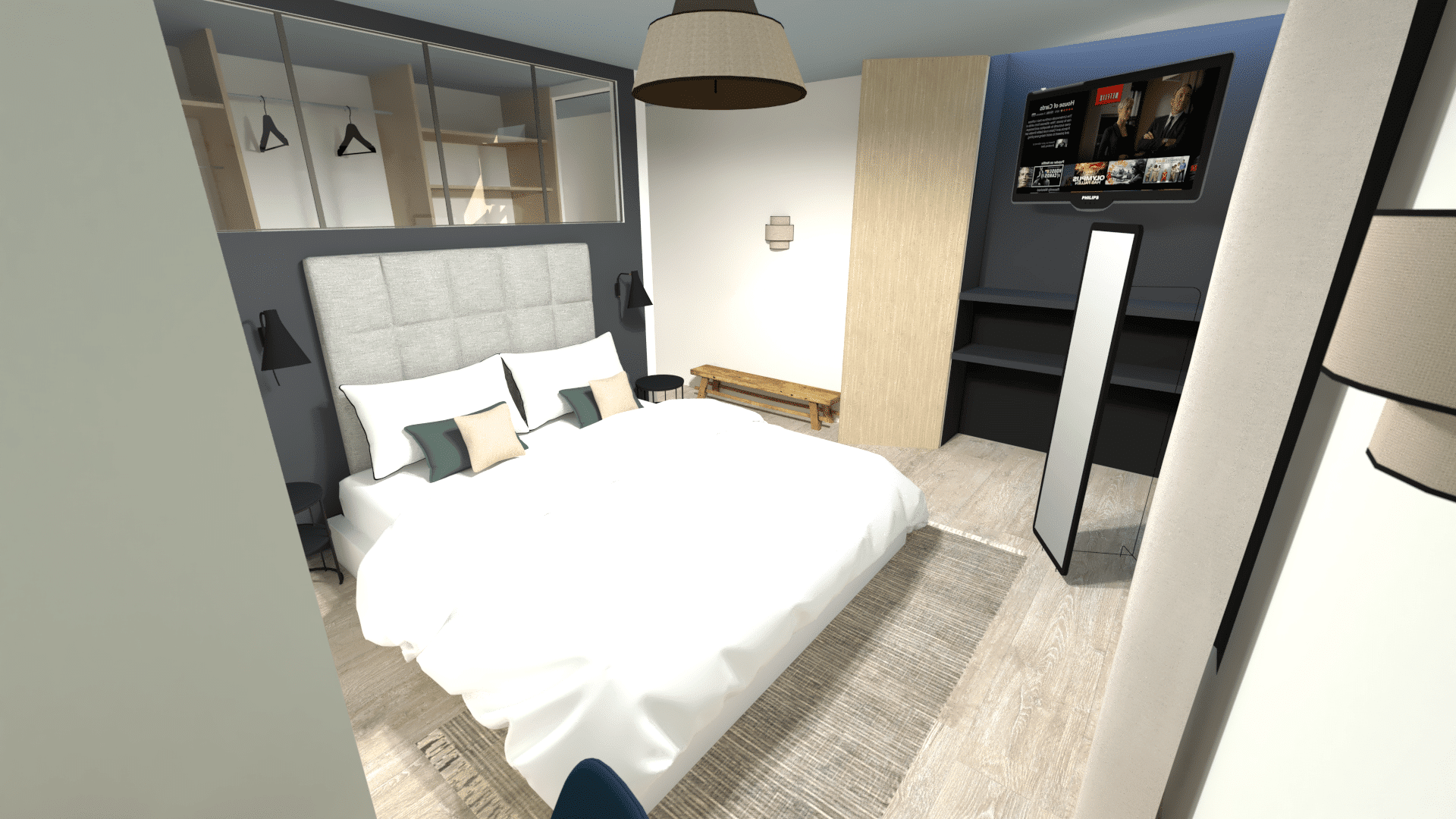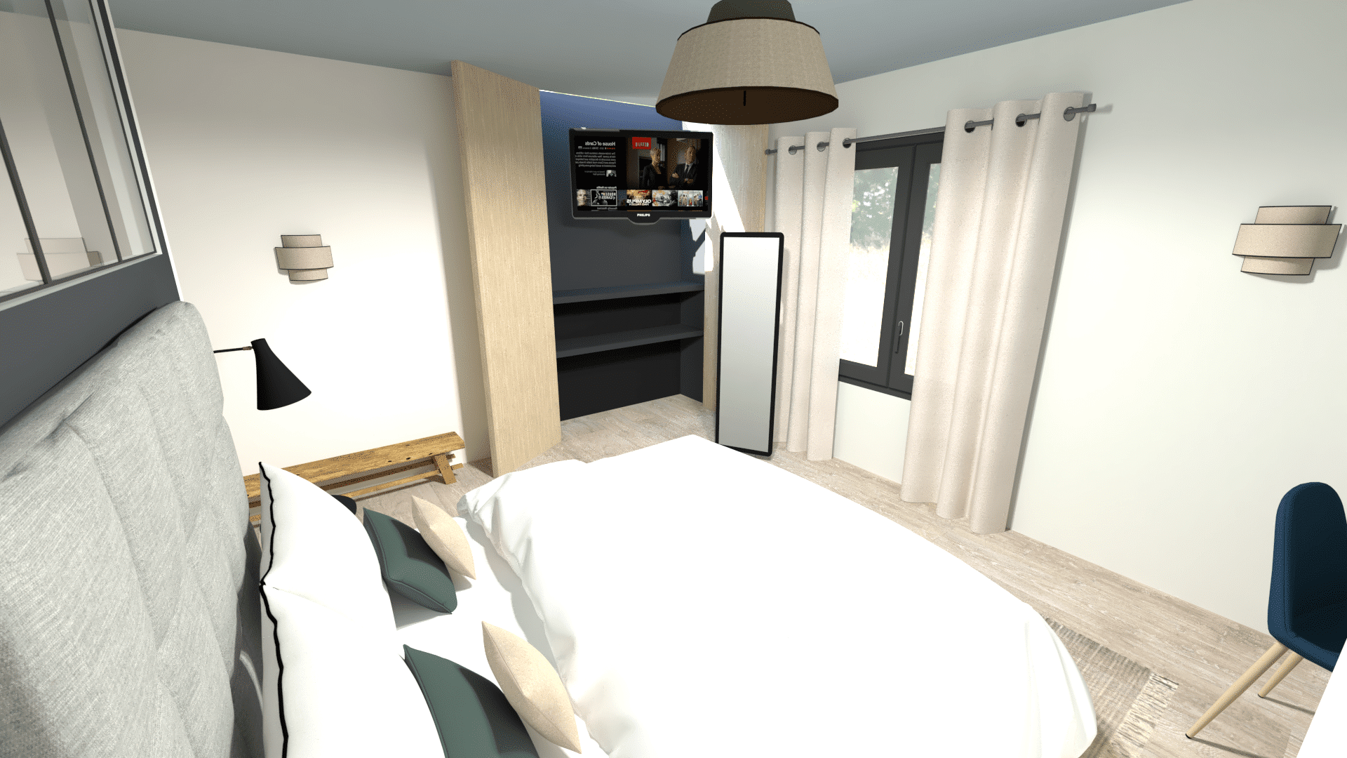 La suite parentale avec dressing intégré a été pensé pour répondre à plusieurs fonctionnalités. La première étant la télévision qui peut se rabattre et venir se dissimuler dans un placard sur-mesure.