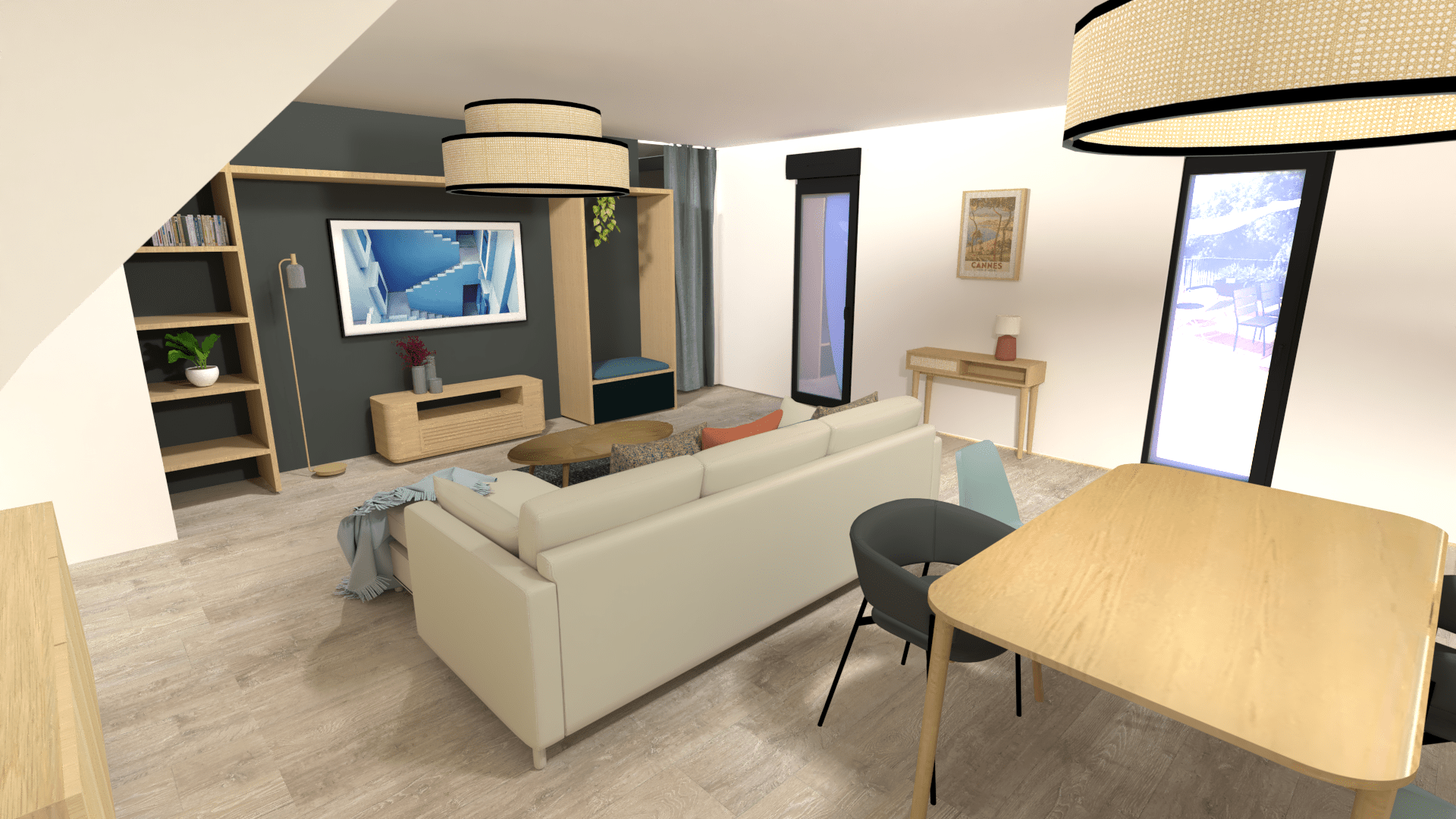 Dans la pièce de vie, j’ai créer un meuble sur-mesure pour venir encadrer le coin télévision, y créer divers rangements ainsi qu’une banquette pour venir s’assoir autour de la table basse, relevé par un vert sapin de chez Farrow&Ball.